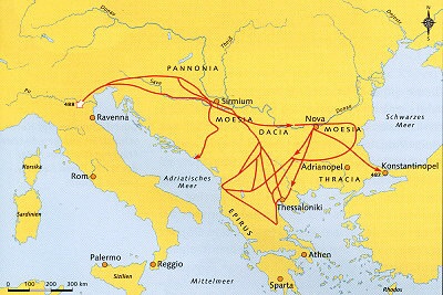Die Ostgoten mußten sich den Hunnen unterwerfen. Ein Teil blieb auf der Krim. Durch Attilas Tod 453 wurden sie frei und zogen wie viele andere Völker oder Stämme auch ins Römische Reich. Sie erhielten einen Föderatenvertrag und siedelten zeitweilig in Pannonien. |