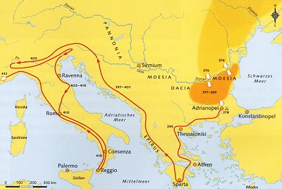 395 erhoben sich die Goten unter ihrem König Alarich. Er brach mit seinem Volk zu einem beispiellosen Plünderungsfeldzug auf, der die Balkanhalbinsel in Trümmer legte und sie bis nach Konstantinopel und den Peloponnes führte. Nachdem sie von dem römischen Feldherrn Stilicho geschlagen wurden, erhalten sie 397 einen neuen Föderatenvertrag und werden in Makedonien angesiedelt. Dort blieben sie aber nur vier Jahre. 401 wandte er sich nach Italien, konnte aber zunächst erneut von dem römischen Feldherrn Stilicho bei Pollentia und Verona zurückgeschlagen werden. Nach dem gewaltsamen Tod Stilicho's (Hinrichtung durch Kaiser Honorius) im Jahre 408 versuchte es Alarich erneut und nahm schließlich 410 Rom ein und plünderten es drei Tage. Wegen der prekären Versorgungslage versuchte Alarich vergeblich nach Nordafrika zu gelangen, auf dem Rückzug nach Norditalien starb er. Sein Nachfolger Athaulf führte die Westgoten dann schließlich nach Gallien. |
