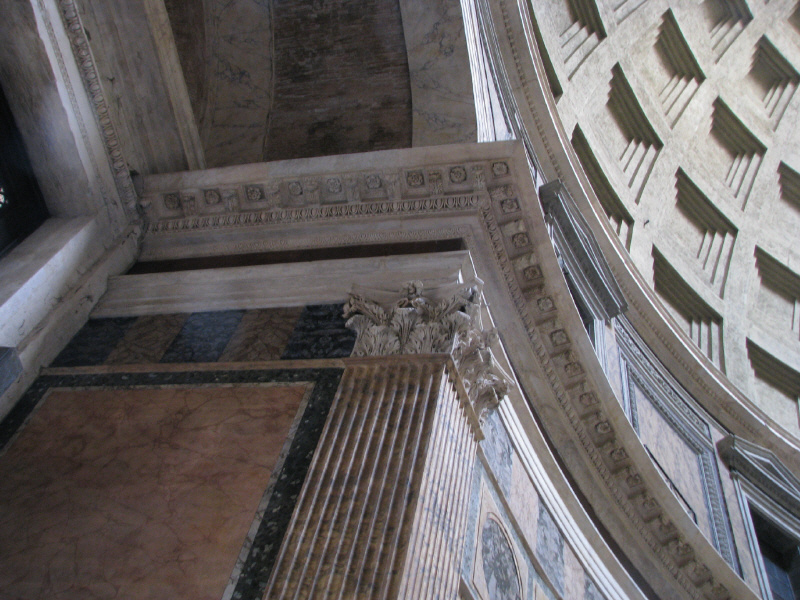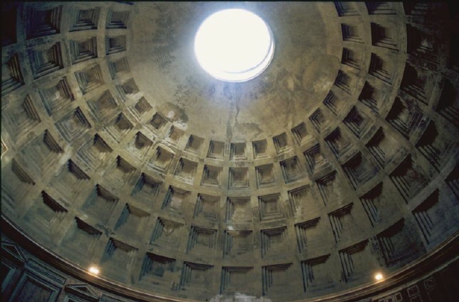 Der gesamte Rundbau ruht auf einer Fundamentierung bestehend aus einem 7,30 Meter breiten und 4,50 Meter breitem Ring aus Gußmauerwerk. Ein 6 Meter starker Mauerring trägt die Kuppel, wobei die Mauer nach oben hin leichter wird. In der Kuppel, die genau halbkugelförmig ist, wurden vulkanische Gesteine verwendet. Mit einem Durchmesser von 43,30 Metern ist sie die größte jemals gemauerte Kuppel der Welt. Innen ist die Kuppel mit fünf Kassettenreihen verziert (siehe das mittlere Bild), die zur Lichtöffnung hin kleiner werden. Diese Öffnung ist fast 9 Meter breit. |