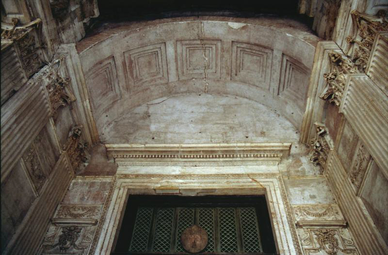 Der Innenraum beeindruckt durch seine monumentale Schlichtheit. An jeder Seite des Innenraum befinden sich drei Exedren, je eine halbrunde in der Mitte und zwei rechteckige mit je drei Nischen links und rechts davon. In den zahlreichen Nischen befanden sich sicher die Götterstatuen. Die Dekoration des Fußboden bestehend aus quadratischen und runden Marmorplatten ist gut erhalten geblieben. |