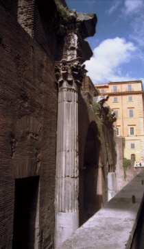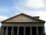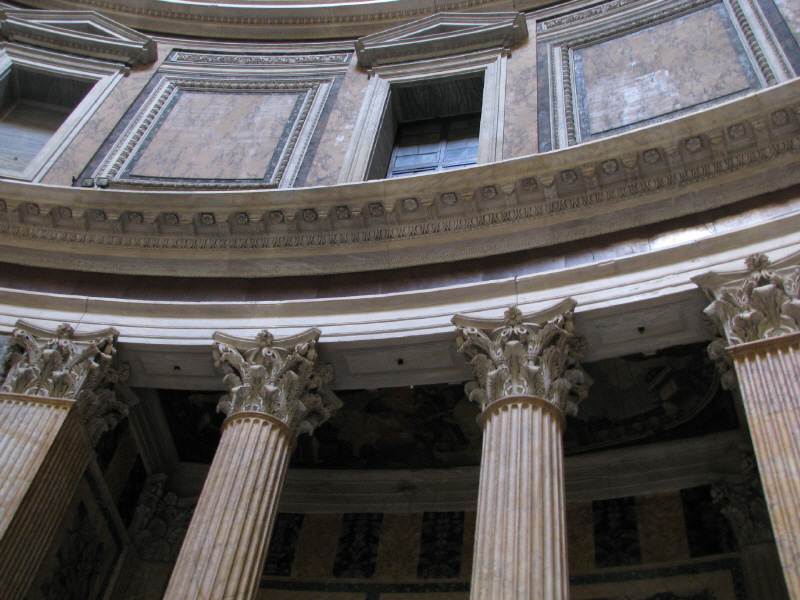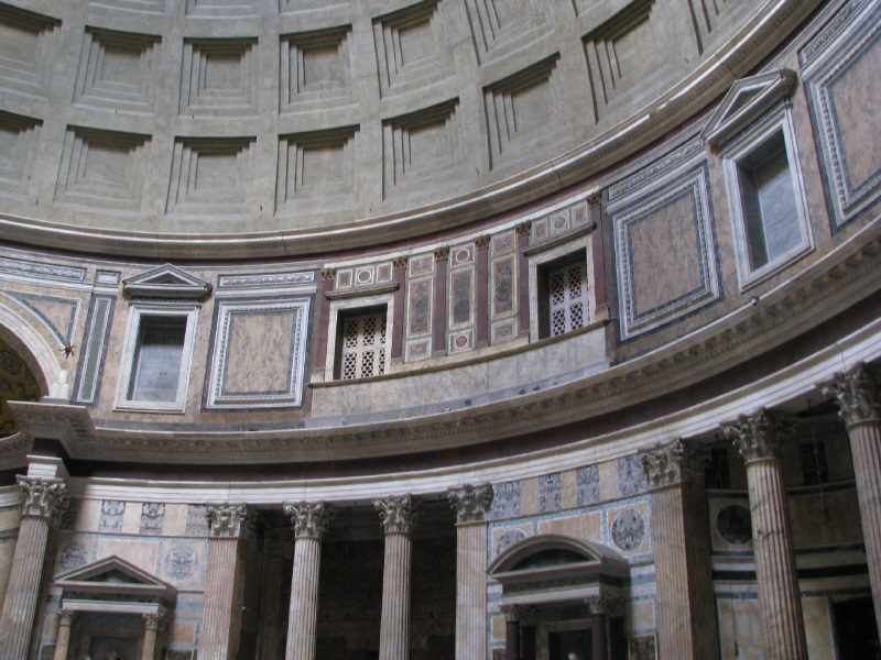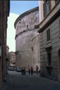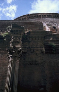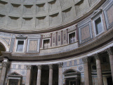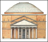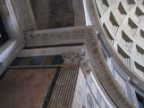 Der erste zwischen 27 und 25 v.Chr. errichtete Bau geht auf Agrippa (den Schwiegersohn des Augustus) zurück. Das Pantheon des Agrippa scheint ein rechteckiger Tempel gewesen zu sein. Von der zweiten Restaurierung unter Domitian nach dem Brand von 80 n.Chr. ist nichts bekannt. Das heute sichtbare Pantheon enstand in den ersten Jahren der Herrschaft des Kaiser Hadrian. Eine weitere Restaurierung gab es dann nochmal 202 n.Chr. Im Jahr 608 schenkte der byzantinische Kaiser Phokas dem Papst Bonifaz III. das Pantheon, 609 wurde es dann in die Kirche S. Maria ad Martyres umgewandelt. Diesem Umstand verdanken wir den heutigen guten Erhaltungszustand. |