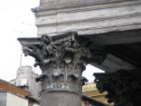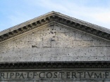Die Vorhalle wurde beim Umbau unter Kaiser Hadrian an der Stelle gebaut, an der vorher der ursprüngliche Tempel stand. Sie ist 33,10 Meter breit und 15,5 Meter tief. Die vorderen Säulen, von denen die beiden linken im 17. Jrh. durch Säulen aus den Nero-Thermen ersetzt wurden, sind aus einem Block gehauene graue Granitsäulen mit korinthischen Kapitellen. Die Kapitelle und die Säulenbasen wurden aus weißem Marmor gefertigt. Hinter der ersten, dritten, sechsten und achten Saülen befinden sind je zwei weitere Säulen in der Tiefe, so daß ein dreischiffiger Vorbau entsteht (gut zu sehen bei den beiden mittleren Bildern). Das breitere Mittelschiff führt auf den Eingang mit der schweren Bronzetür zu. Die Seitenschiffe führe auf je eine Statuennische zu. Hier standen Statuen der Kaiser Hadrian und Augustus. Die Inschrift auf dem Giebel (siehe Bild oben) stammt von Kaiser Hadrian und erinnert an Agrippa, den Erbauer des ersten Tempel an dieser Stelle. |