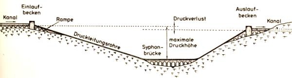 Bei jüngeren griechischen und römischen Druckstrecken mündete die Leitung vor der zu überbrückenden Senke in ein Einlaufbecken. Diese waren, je nach örtlichen Gegebenheiten, mit oder ohne turmartige Unter- konstruktionen versehen. Die von diesem Becken talwärts laufende Leitung, die am Grund der Senke horizontal verlaufende Siphonstrecke und die wieder bergan laufende Leitung wurden wegen des höheren Druckes immer als geschlossene Rohleitungen ausgeführt. Das Auslaufbecken (mit oder ohne Unterbau) am Zielort, welches tiefer als das Einlaufbecken liegen musste, diente der Regulierung und der Weiterleitung des Wasser in einen oder mehrere abzweigende Kanäle. Ein Musterbeispiel einer solchen Anlage ist der Aquädukt von Aspendos (Türkei). |