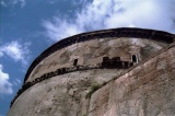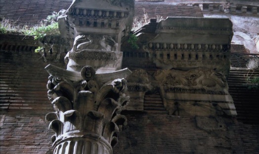 Auf der Rückseite des Rundbau befand sich die Neptuns-Basilika. Davon zeugt noch der teilweise erhaltene Fries mit den gut zu sehenden Dreizacken und Delphinen.