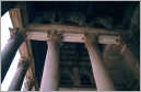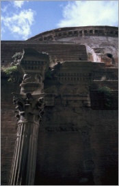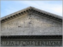 Die Vorhalle wurde beim Umbau unter Kaiser Hadrian an der Stelle gebaut, an der vorher der ursprüngliche Tempel stand. Sie ist 33,10 Meter breit und 15,5 Meter tief. Die vorderen Säulen, von denen die beiden linken im 17. Jrh. durch Säulen aus den Nero-Thermen ersetzt wurden, sind aus einem Block gehauene graue Granitsäulen mit korinthischen Kapitellen. Die Kapitelle und die Säulenbasen wurden aus weißem Marmor gefertigt. Hinter der ersten, dritten, sechsten und achten Saülen befinden sind je zwei weitere Säulen in der Tiefe, so daß ein dreischiffiger Vorbau entsteht (gut zu sehen bei den beiden mittleren Bildern). Das breitere Mittelschiff führt auf den Eingang mit der schweren Bronzetür zu. Die Seitenschiffe führe auf je eine Statuennische zu. Hier standen Statuen der Kaiser Hadrian und Augustus. Die Inschrift auf dem Giebel (siehe Bild oben) stammt von Kaiser Hadrian und erinnert an Agrippa, den Erbauer des ersten Tempel an dieser Stelle.