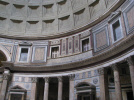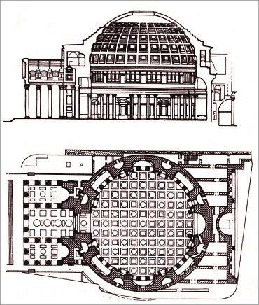Der gesamte Rundbau ruht auf einer Fundamentierung bestehend aus einem 7,30 Meter breiten und 4,50 Meter breitem Ring aus Gußmauerwerk. Ein 6 Meter starker Mauerring trägt die Kuppel, wobei die Mauer nach oben hin leichter wird. In der Kuppel, die genau halbkugelförmig ist, wurden vulkanische Gesteine verwendet. Mit einem Durchmesser von 43,30 Metern ist sie die größte jemals gemauerte Kuppel der Welt. Innen ist die Kuppel mit fünf Kassettenreihen verziert (siehe das mittlere Bild), die zur Lichtöffnung hin kleiner werden. Diese Öffnung ist fast 9 Meter breit.