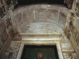 Der Innenraum beeindruckt durch seine monumentale Schlichtheit. An jeder Seite des Innenraum befinden sich drei Exedren, je eine halbrunde in der Mitte und zwei rechteckige mit je drei Nischen links und rechts davon. In den zahlreichen Nischen befanden sich sicher die Götterstatuen. Die Dekoration des Fußboden bestehend aus quadratischen und runden Marmorplatten ist gut erhalten geblieben.